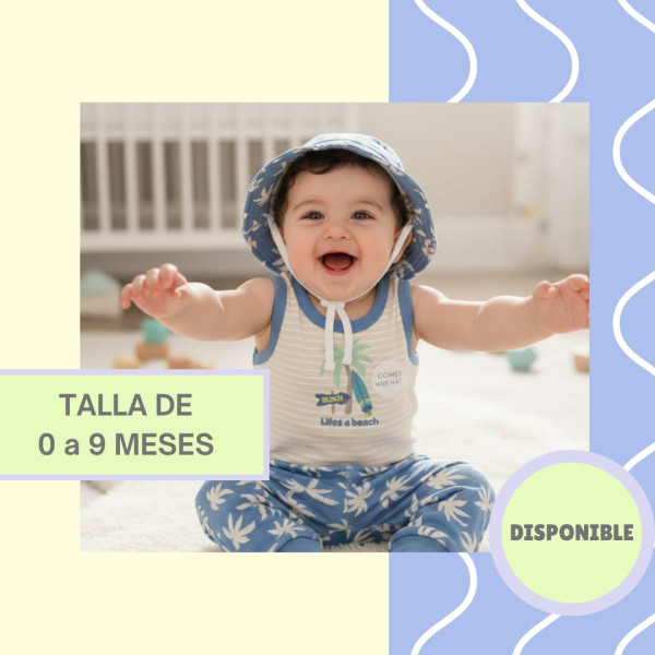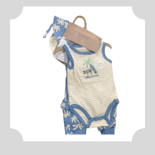 Traje de tres piezas, pantalon, body y gorrito